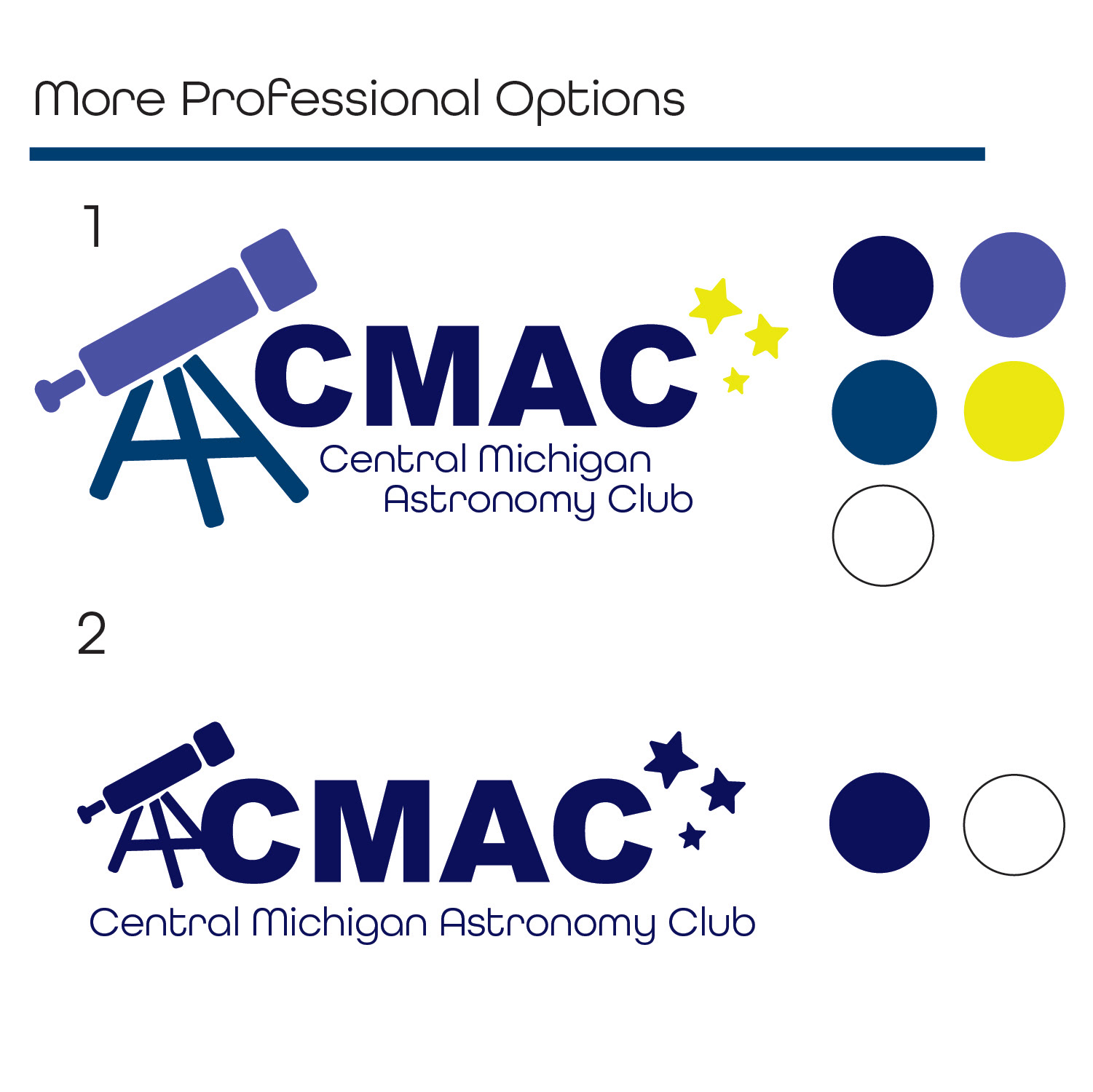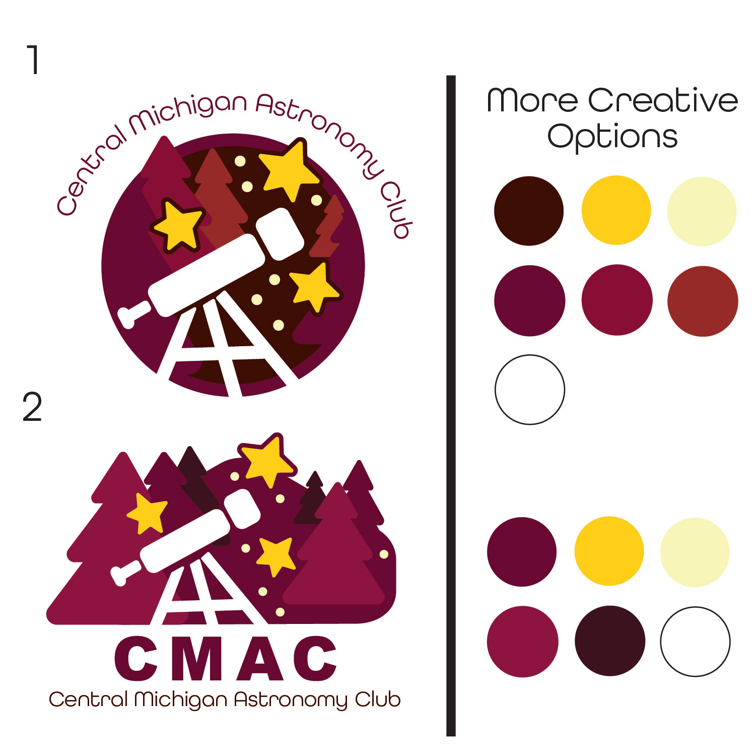 I was contacted by the Central Michigan Astronomy Club for a logo. The club explained they needed stars and a telescope to be in the logo to showcase their focus on astronomy, along with the fully written out acronym of the club in a more "fun" and illustrative manner. They originally had a blocky and stale CMAC wordmark that they were not fans of. After seeing and loving my logo they have continued to use it at Central Michigan University for events, apparel, flyers, stickers, and so much more!